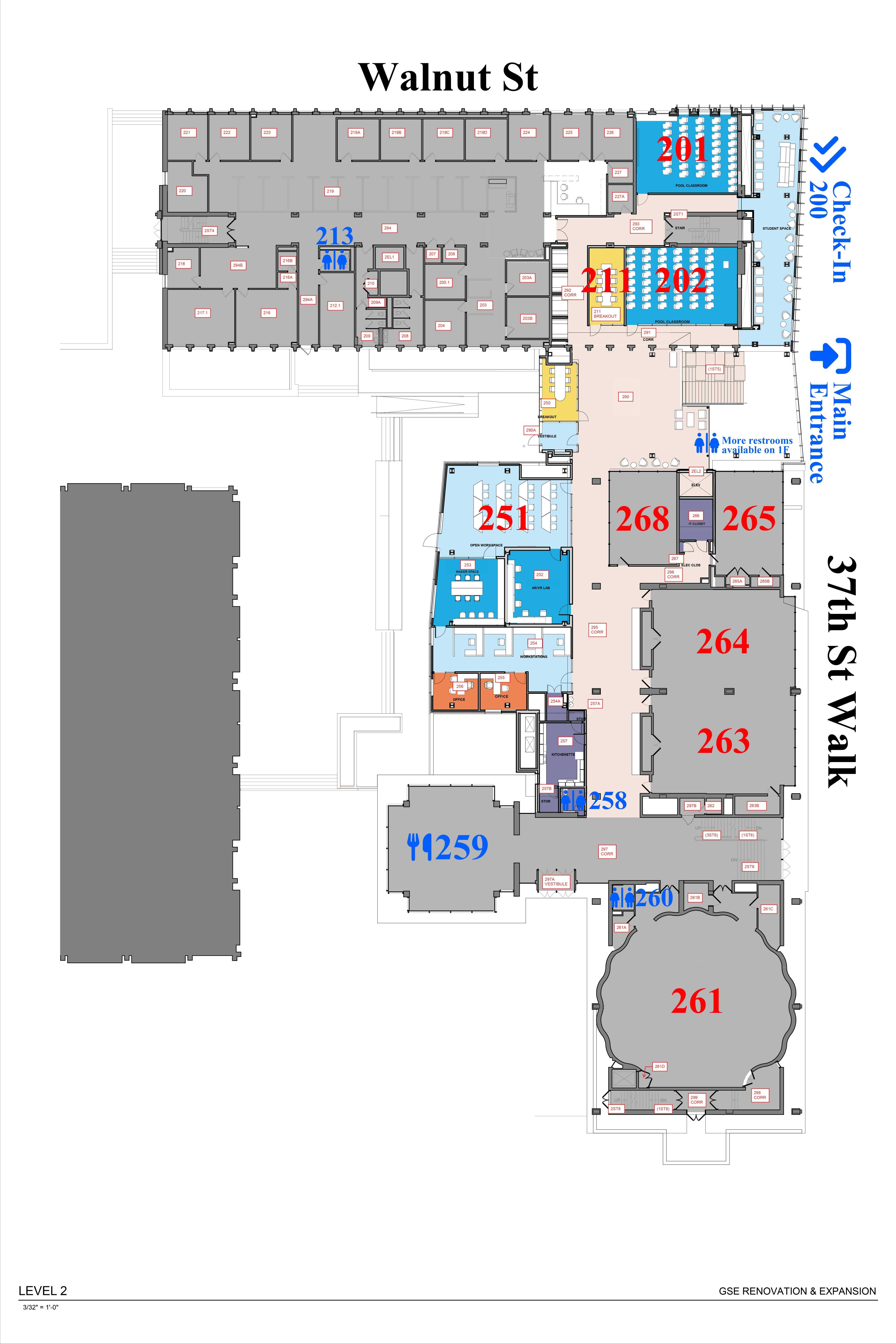 The majority of the conference will be held on the second floor of the GSE Building. Below is the 2nd Floor Plan for your reference. The main venues are highlighted in bold dark blue text on the map for easy identification.