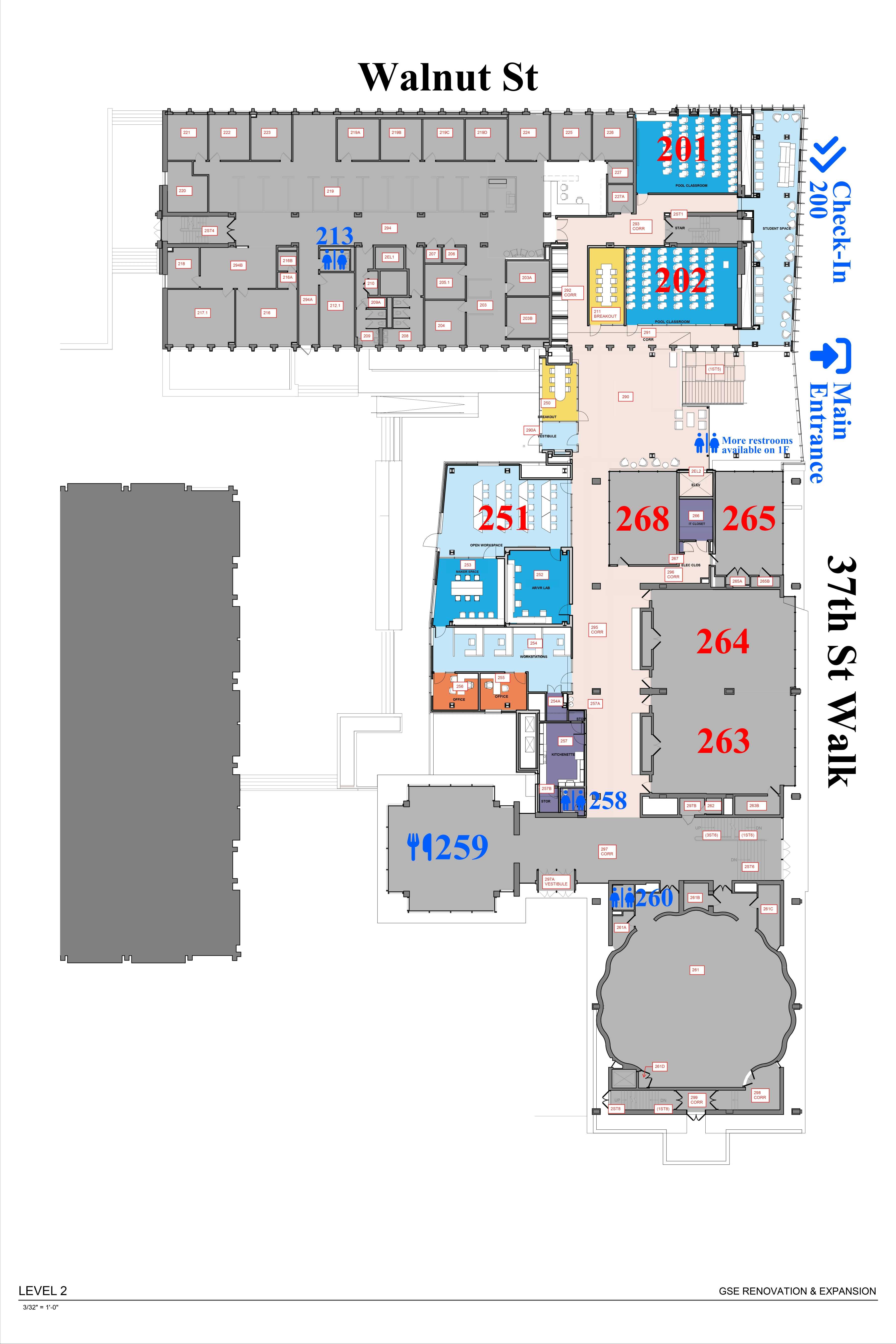 The majority of the conference will be held on the second floor of the GSE Building. Below is the 2nd Floor Plan for your reference. The main venues are highlighted in bold dark blue text on the map for easy identification.